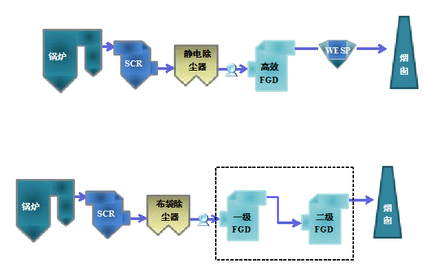 鉴于改造项目的情况比较复杂,在改造过程中,尽可能利用原有设备,或对原有设备进行升级改造。该工艺路线的确定需要根据现场情况、设备运行状况和排放指标进行调整,最终实现 “超低排放”的目的。